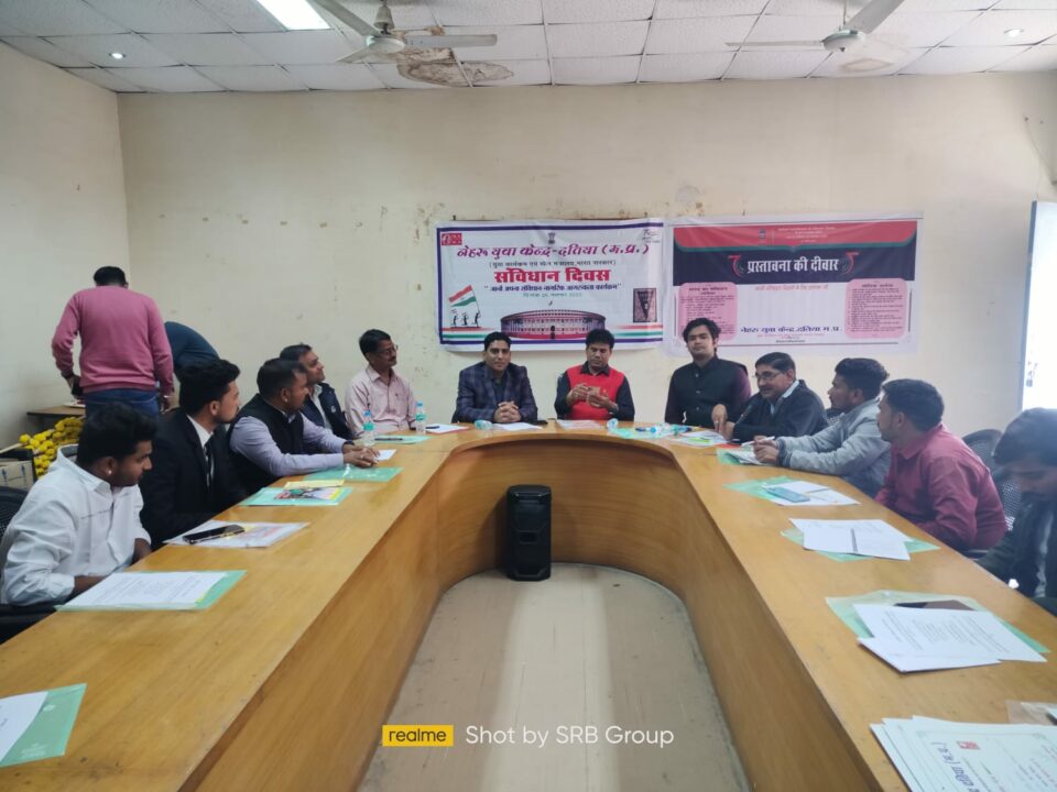 दतिया – राष्ट्र निर्माण में युवाओं की भागीदारी सुनिश्चित करने एवं युवा प्रतिभाओं को मंच प्रदान करने के उद्देश्य से नेहरू युवा केंद्र दतिया (युवा कार्यक्रम एवं खेल मंत्रालय,भारत सरकार) द्वारा संविधान दिवस के उपलक्ष्य में एक संगोष्ठी का आयोजन नेहरु युवा केंद्र दतिया द्वारा जिला पंचायत सभागार में किया गया जिसमें जिले के विभिन्न युवा मण्डलों के लगभग 60 से युवाओं ने भाग लिया।