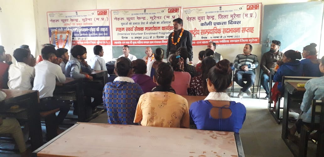 मुरैना – नेहरू युवा केन्द्र मुरैना द्वारा इन्टर स्कूल सुमावली एवं मुंगावली में गहन स्वयं सेवक नामांकन, कौमी एकता दिवस/सप्ताह, स्वयं सेवी सक्रियता अभियान सेवा के तहत कार्यक्रम का आयोजन किया गया। जिसमें राकेश सिंह तोमर उपनिदेशक नेहरू युवा केन्द्र मुरैना ने बताया कि प्रतिभावान छात्र या नौजवान जो 15 से 29 वर्ष के हैं जिनमें कुछ करने का कौशल एवं सेवाभाव है। जैसे सांस्कृतिक कार्यक्रम, खेलकूद, नृत्य, वक्तव्य कला, चित्रकला, समाज सेवा आदि में पारंगत है। ऐसे नौजवानों की इस फार्म को भरकर कार्यालय पर जमा करें ये पूरी जानकारी भारत सरकार के आदेशानुसार ली जा रही है, उन्हें आॅनलाईन रजिस्टर्ड किया जा रहा है। अतः आप सभी को इस संबंध में जागरूक करने के लिए यह अभियान चलाया जा रहा है।