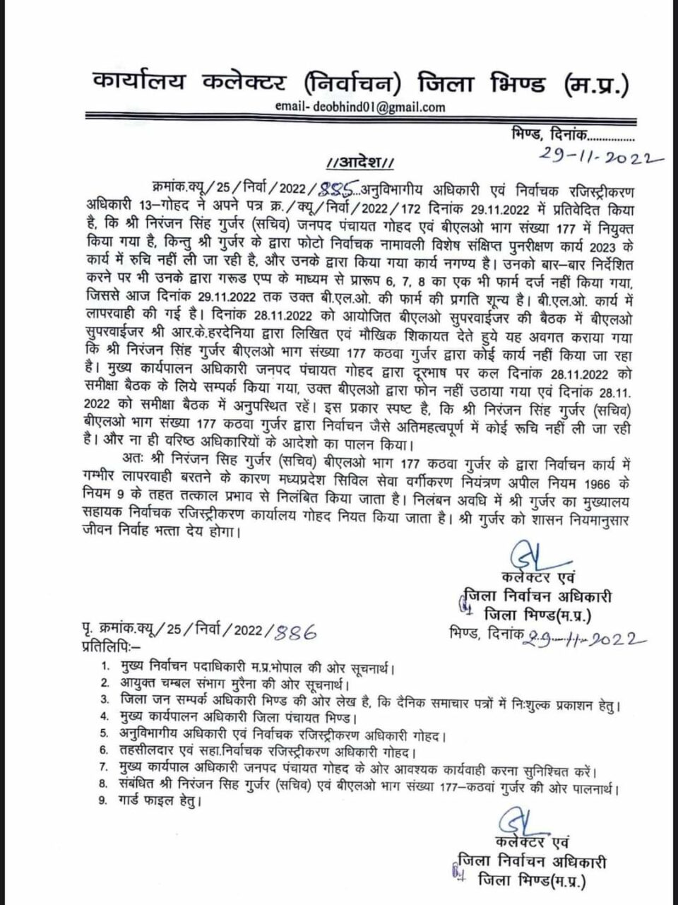 भिण्डभिण्ड निर्वाचन कार्य में लापरवाही बरतने पर BLO निरंजन सिंह गुर्जर तत्काल प्रभाव से निलंबित by editorNovember 30, 20220 Share0 भिण्ड कलेक्टर जिला निर्वाचन अधिकारी डॉ सतीश कुमार एस ने निर्वाचन कार्य में गम्भीर लापरवाही बरतने पर बीएलओ श्री निरंजन सिंह गुर्जर को तत्काल प्रभाव से निलंबित किया।