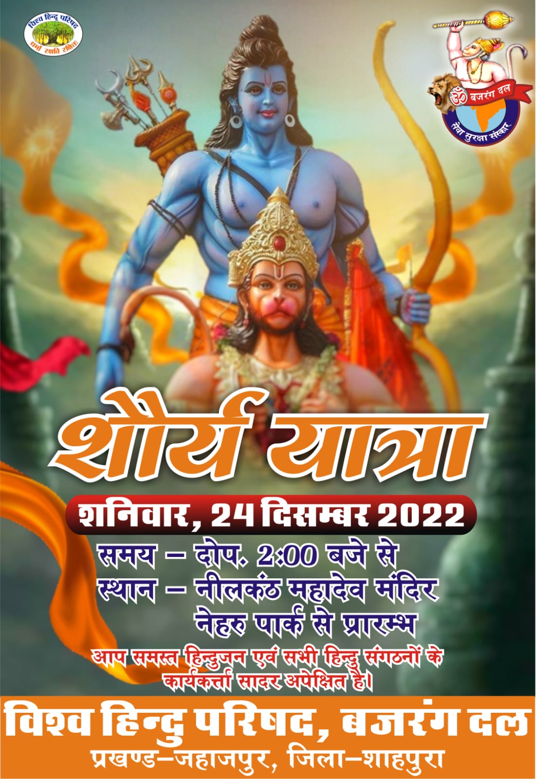बजरंग दल के प्रखंड संयोजक एडवोकेट जितेंद्र मीणा ने जानकारी देते हुए बताया कि आज प्रखंड मुख्यालय जहाजपुर पर बजरंग दल अपने कार्यकर्ताओं द्वारा शौर्य पथ संचलन शहर के विभिन्न मार्गो से होता हुआ निकालेगा।