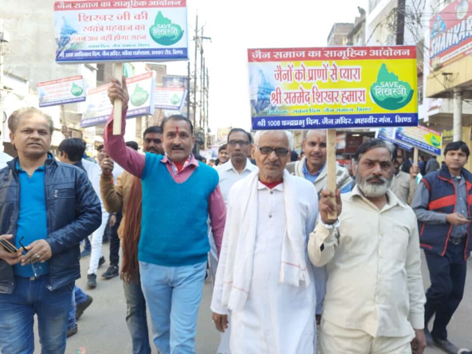 भिण्ड । जैन समाज के तीर्थ श्री सम्मेद शिखर को अहिंसा तीर्थ घोषित कराने के लिए जैन समाज के साथ सर्व समाज सामुहिक रूप से केंद्र सरकार से विगत कई दिनों से मांग कर रहा है।श्री सम्मेद शिखर के सम्मान में जैन समाज द्वारा पूर्व से घोषित कार्यक्रम के अनुसार आज संपूर्ण भिंड जिला बंद रहा।श्री सम्मेद शिखर के सम्मान में मुनि प्रतीक सागर महाराज के नेतृत्व में