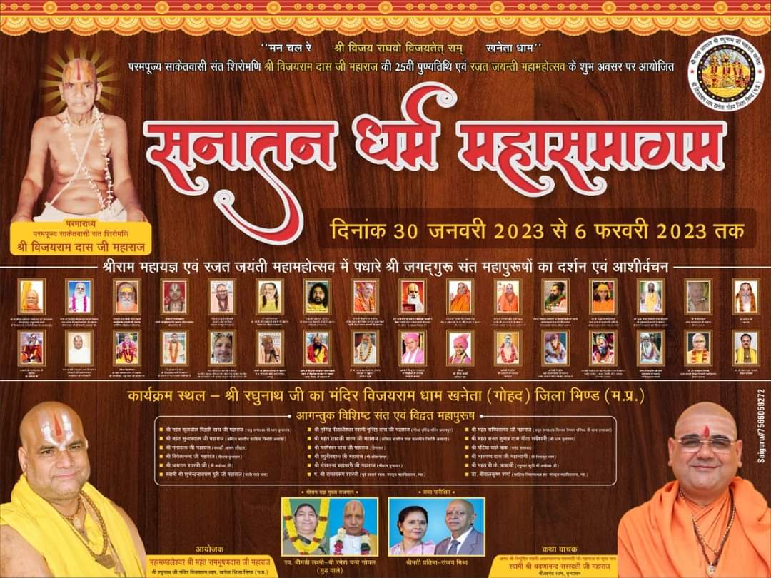 ग्वालियर । संत शिरोमणि श्री विजयराम दास महाराज की 25वीं पुण्यतिथि की रजत जयंती के महामहोत्सव के अवसर पर 30 जनवरी से 6 फरवरी तक श्री रघुनाथजी का मंदिर में आठ दिवसीय सनातन धर्म महासमागम आयोजित किया जाएगा। जहां देश भर के जगद्गुरु, संत महापुरुषों का संगम होगा। सनातन धर्म महासमागम के आयोजक एवं पंडित विजयरामदास महाराज स्मृति परमार्थ न्यास के अध्यक्ष महामण्डलेश्वर श्रीमहंत रामभूषण दास महाराज, आयोजन के प्रशासनिक समन्वय अपर कलेक्टर रूपेश उपाध्याय एवं डॉ. केशव पाण्डेय ने पड़ाव स्थित इंटरनेशनल सेंटर ऑॅफ मीडिया एक्सीलेंस (आईकॉम) पर आयोजित पत्रकार-वार्ता में यह जानकारी दी। महामंडलेश्वर ने बताया कि महासमागम के दौरान प्रतिदिन प्रातः 8 से 10.30 बजे तक श्रीराम महायज्ञ, 11 बजे से अपरांह 1.35 बजे तक भागवत कथा होगी। दोपहर 2 बजे से सायं 5 बजे तक संत प्रवचन एवं 7 बजे से रात्रि 10 बजे तक सांस्कृतिक कार्यक्रम एवं रासलीला के आयोजन होंगे। जबकि 6 फरवरी को पूर्णाहूति, संत समागम एवं विशाल भंडारा आयोजित किया जाएगा। इससे पूर्व 28 जनवरी को प्रातः 10 बजे श्रीरामार्चा महायज्ञ होगा और 29 जनवरी रविवार को प्रातः 10 बजे भव्य कलश यात्रा निकाली जाएगी। कलश यात्रा गोहद नगर से प्रारंभ होकर श्री रघुनाथजी मंदिर विजयराम धाम खनेता पहुंचेगी। श्री उपाध्याय ने बताया कि महासमागम में