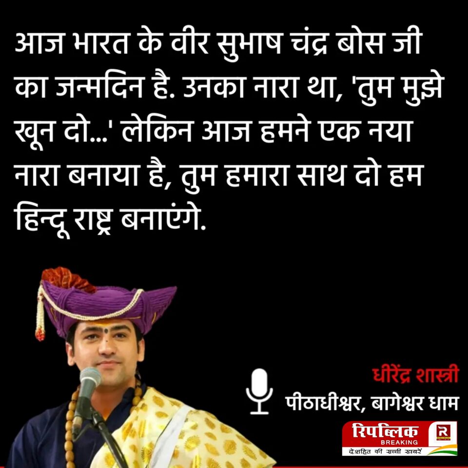 रायपुर। राजधानी के गुढ़ियारी में चल रहे बागेश्वर धाम महाराज पंडित धीरेंद्र कृष्ण शास्त्री के कथा का आज अंतिम दिन है। वहीं आज बागेश्वर धाम के महाराज ने अपने कथा के दौरान नेताजी सुभाषचन्द्र बोस की जयंती पर उनकी वीरता को याद किया। और कहा कि नेताजी बोस का नारा था कि तुम मुझे खून दो, मैं तुम्हे आजादी दूंगा। मेरा नारा है कि तुम मेरा साथ दो मैं तुम्हें हिंदू राष्ट्र दूंगा। चूड़ी पहनकर घर पर मत बैठना। सदियों से संतों को नहीं छोड़ा तो हमें क्या छोड़ेंगे। मीरा, तुलसी, रैदास को नहीं छोड़ा तो हमें तो विरोधी गरियाएंगे ही। हिंदुओं एक हो जाओ।