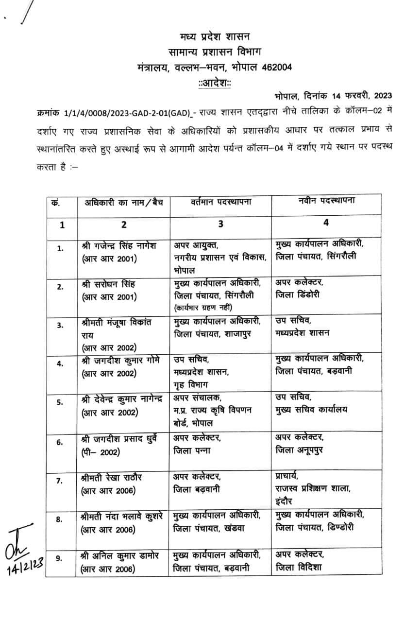 मध्यप्रदेशमध्यप्रदेश में बड़ी प्रशासनिक फेरबदल बदले गए 37 प्रशासनिक सेवा के अधिकारी देखे अधिकारियों की नवीन पदस्थापना by editorFebruary 14, 20230 Share0