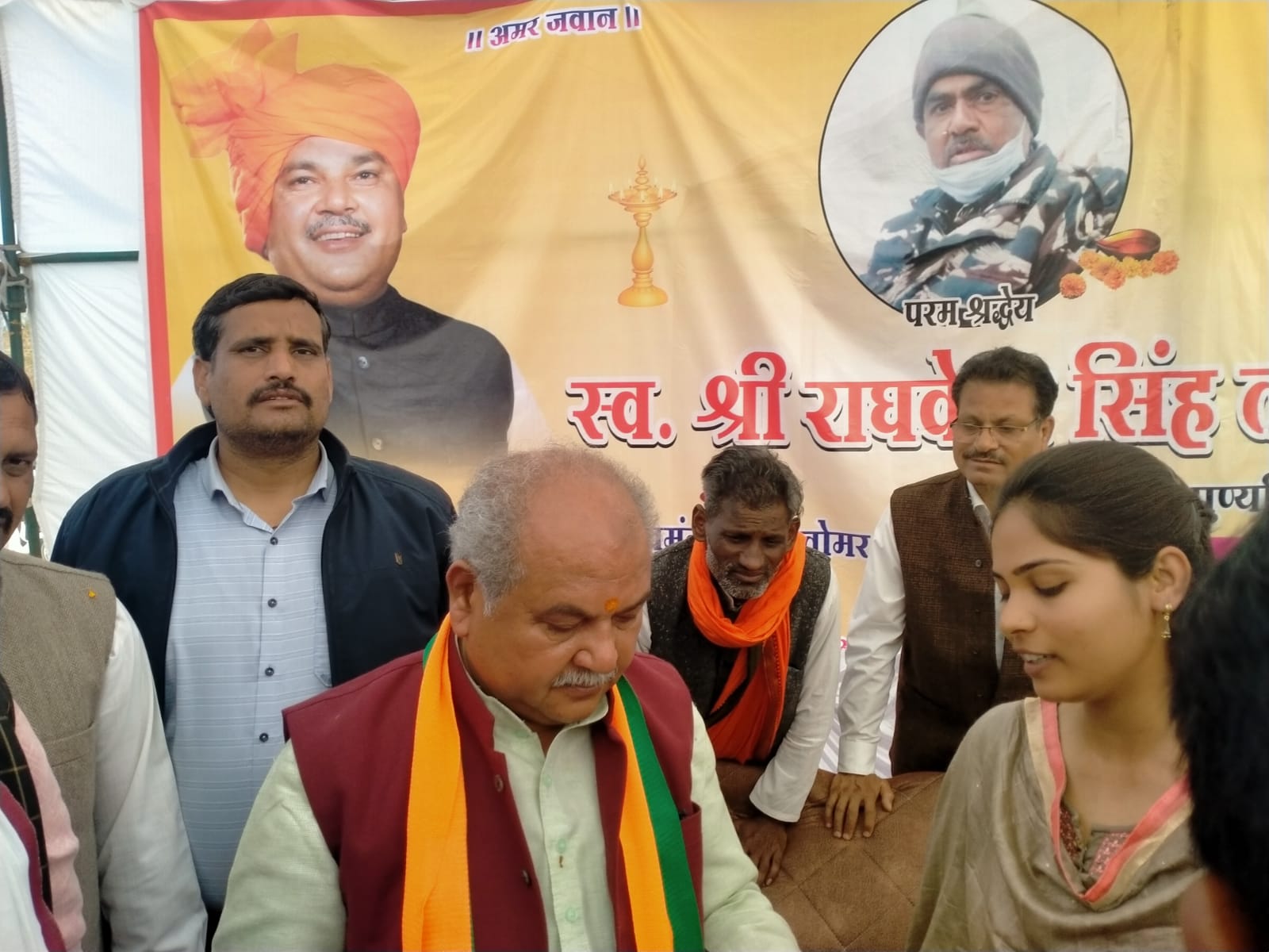 अंबाह। केंद्रीय कृषि मंत्री नरेंद्र सिंह तोमर ने गुरूवार को थरा गांव में सीआरपीएफ के जवान शहीद राघवेंद्र तोमर की प्रतिमा का अनावरण किया और कहा कि राघवेंद्र ने देश के लिए अपने प्राणों की शहादत दी है जो क्षेत्र एवं उनके परिवार के लिए गौरव की बात है। इस दौरान उपस्थित ग्रामीणों को संबोधित करते हुए उन्होंने कहा कि प्रतिमा लगाने के दो कारण होते हैं, इसमें पहला आस्था और श्रद्धा और दूसरा प्रतिमा पर नजर पड़े तो जीवन इतिहास की प्रेरणा मिले। शहीद राघवेंद्र तोमर की प्रतिमा दोनों कारणों की अभिव्यक्ति करेगी। स्वाभिमान व्यक्तिगत, पारिवारिक व राष्ट्रीय होता है। देश के वीर सपूतों के लिए जब दुनिया की बड़ी से बड़ी ताकत देश की एकता, सुरक्षा, अखंडता और संप्रभुता पर आंख उठाती है तो उनके भीतर राष्ट्रीय स्वाभिमान सर्वोपरि होता है। राष्ट्रीय स्वाभिमान के धनी चंद्र शेखर आजाद ने अंग्रेजों की गोली खाने से बेहतर खुद को गोली मार ली थी। शहीद राघवेंद्र एक होनहार सैनिक थे। यह वीरों की भूमि है। आपदा ही नहीं संकट की घड़ी में भी हमारे देश व राज्य के वीरों ने शहादत दी है। केंद्रीय मंत्री ने कहा कि सरकार की ओर से शहीद आश्रित परिवार को हरसंभव सहायता प्रदान की जाएगी। उन्होंने कहा कि शहीदों के बलिदान को भुलाया नहीं जा सकता। शहीदों के जीवन से प्रेरणा लेकर राष्ट्र सेवा के लिए हमें तत्पर रहना चाहिए। शहीदों के आदर्शों को अपनाना एवं उन्हें याद रखना उनको सच्ची श्रद्धाजलि होगी। तोमर ने कहा कि चंबल क्षेत्र वीरों की भूमि है। सरकार शहीदों के परिवारों को समय समय पर लाभान्वित कर रही है। तोमर ने कहा कि भारत की आजादी व सीमाएं सुरक्षित सेना व सेना में वीरगति प्राप्त हुए शहीदों के कारण ही है। ऐसे लोगों का देश हमेशा ऋणी रहेगा। उन्होंने कहा कि देशभक्ति से बड़ी भावना कोई नहीं होती है। शहीद राघवेंद्र के परिजन प्रताप सिंह तोमर, धर्मेंद्र सिंह तोमर, प्रदीप सिंह तोमर आदि ने अपने लाडले की शहादत को देश व गांव वासियों के लिए गौरवपूर्ण बताया। इस मौके पर ऊर्जा विकास निगम अध्यक्ष गिर्राज दंडोतिया, पूर्व विधायक शिवमंगल तोमर, विधायक कमलेश जाटव, पूर्व विधायक शिवमंगल तोमर, जनपद अध्यक्ष मधुरिमा तोमर, जिलाध्यक्ष योगेशपाल गुप्ता, कलेक्टर अंकित अस्थाना, एसपी आशुतोष बागरी, एसडीएम राजीव समाधिया सहित गणमान्य नागरिकों ने शहीद को नमन कर श्रद्धांजलि दी।