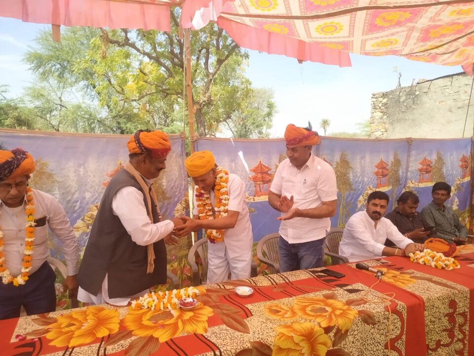 मुख्य अतिथि श्री रामकुमार सर्राफ ने अपने साथ लाई हुई विशिष्ट मेवाड़ी पगड़ी पहनाकर नवनिर्वाचित समिति अध्यक्ष श्री घीसा लाल जैन एवम व्यवस्थापक श्री छीतर लाल धाकड़ का आत्मीयता से स्वागत किया।