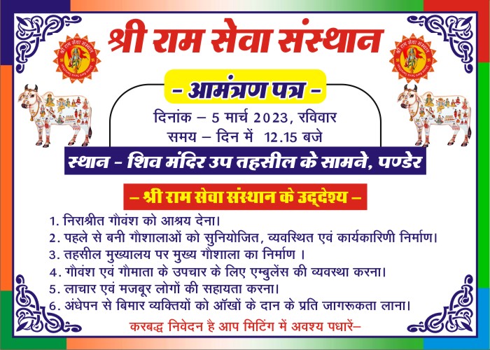 संस्था के प्रमुख श्री अनिल शर्मा ने बताया की रविवार 5 मार्च 2023 को शिव मंदिर पंडेर में होने वाले सम्मेलन के लिए भीलवाड़ा जिले के समस्त सरपंचो, गो भक्तों एवं प्रमुख सामाजिक कार्यकर्ताओ, हिंदू संगठनों, सभी को आमंत्रित किया गया है।
