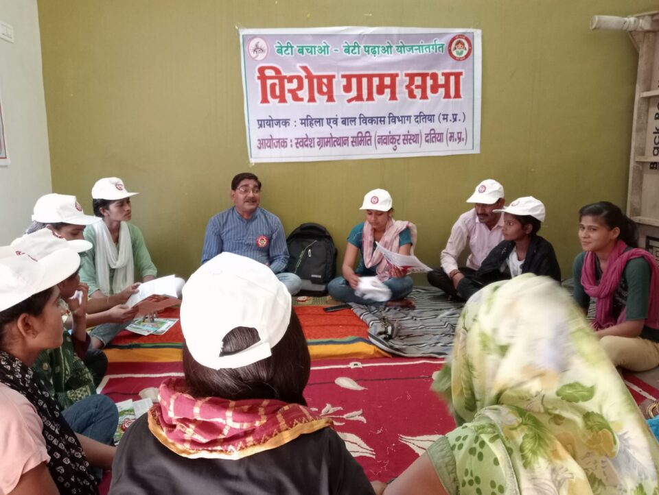 विभिन्न स्तरों पर जैंडर भेद को समाप्त करने व बेटियों और महिलाओं को संरक्षण के अधिकार व समुचित विकास के अवसर मुहैया कराने के साथ ही सुरक्षित वातावरण मुहैया हो सके इस उद्देश्य बेटी बचाओ-बेटी पढ़ाओ योजना के अंतर्गत अरविंद उपाध्याय जिला कार्यक्रम अधिकारी महिला एवं बाल विकास विभाग के निर्देशन में स्वदेश ग्रामोत्थान समिति (नवांकुर संस्था) दतिया के तत्वावधान में चयनित ग्रामों में बेटी बचाओ-बेटी पढ़ाओ योजनांतर्गत विशेष ग्राम सभाओं का आयोजन सतत रूप से किया जा रहा है।