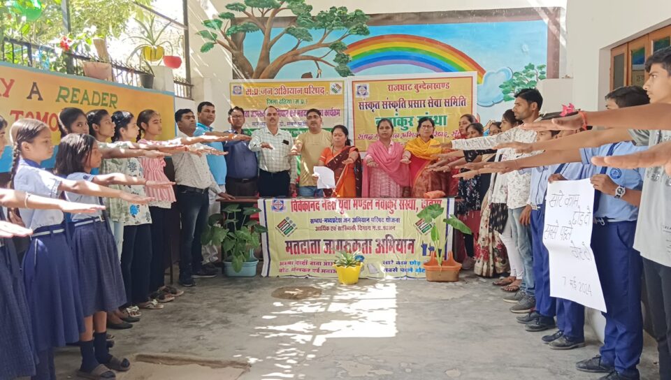 आयोजित मतदाता उन्मुखीकरण कार्यक्रम मप्र जन अभियान परिषद व नेहरू युवा केन्द्र से सम्बद्ध स्वदेश ग्रामोत्थान समिति व विवेकानंद युवा मंडल के संयुक्त तत्वावधान में किया गया। कार्यक्रम में उपस्थित स्वयंसेवी संगठनों के प्रतिनिधि, स्कूली स्टाफ व छात्र-छात्राओं को मतदान के महत्व को स्पष्ट करते हुए स्वयं मताधिकार का उपयोग करने व अन्य मतदाताओं को प्रेरित करने, मतदान कर राष्ट्र निर्माण में योगदान देने का आव्हान सामाजिक कार्यकर्ता रामजीशरण राय ने किया। स्वीप टीम सदस्य श्रीमती आकांक्षा रावत ने 07 मई 2024 को होने वाले मतदान के लिए आमजन को प्रेरित करने हेतु शपथ दिलाई गई।