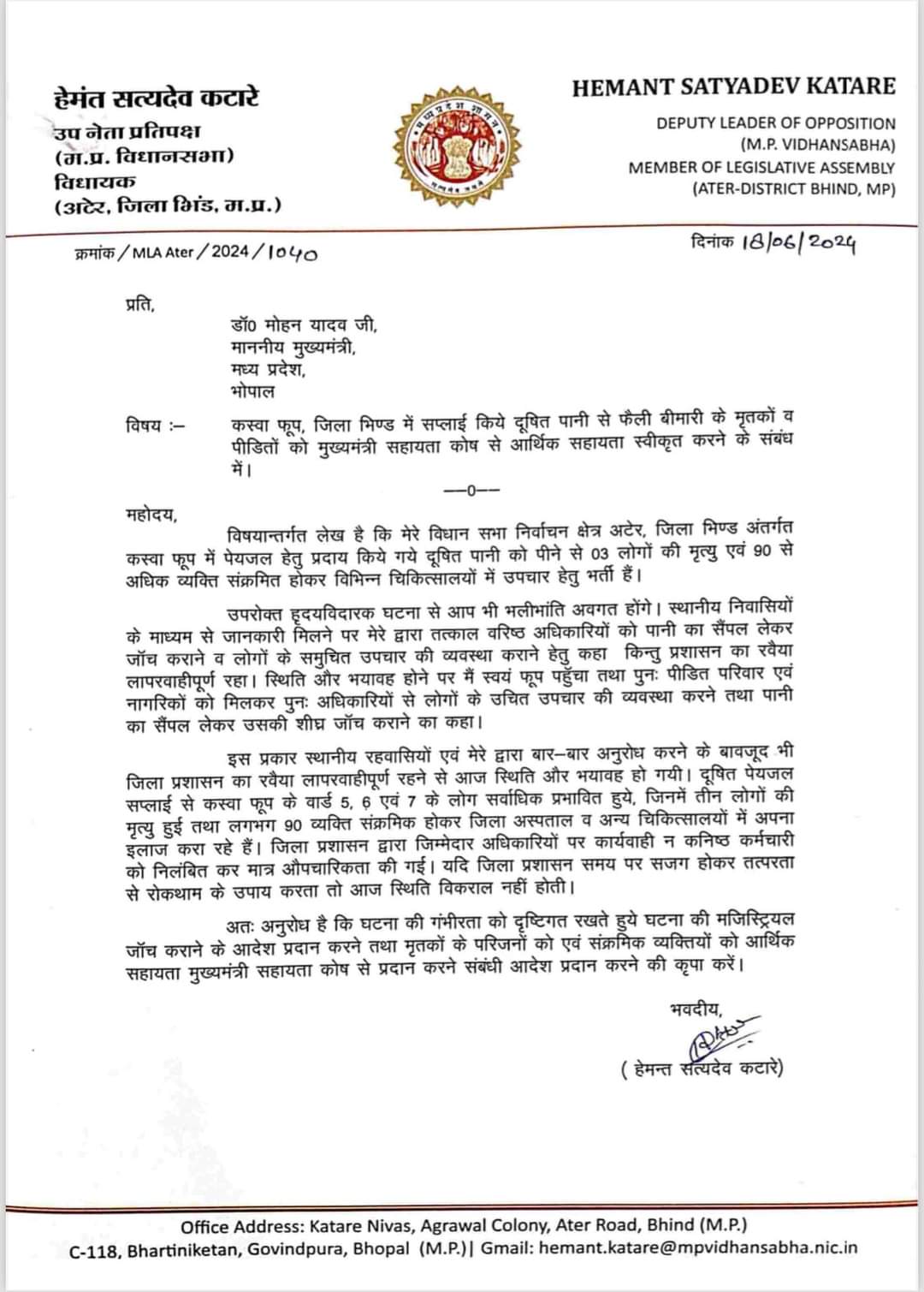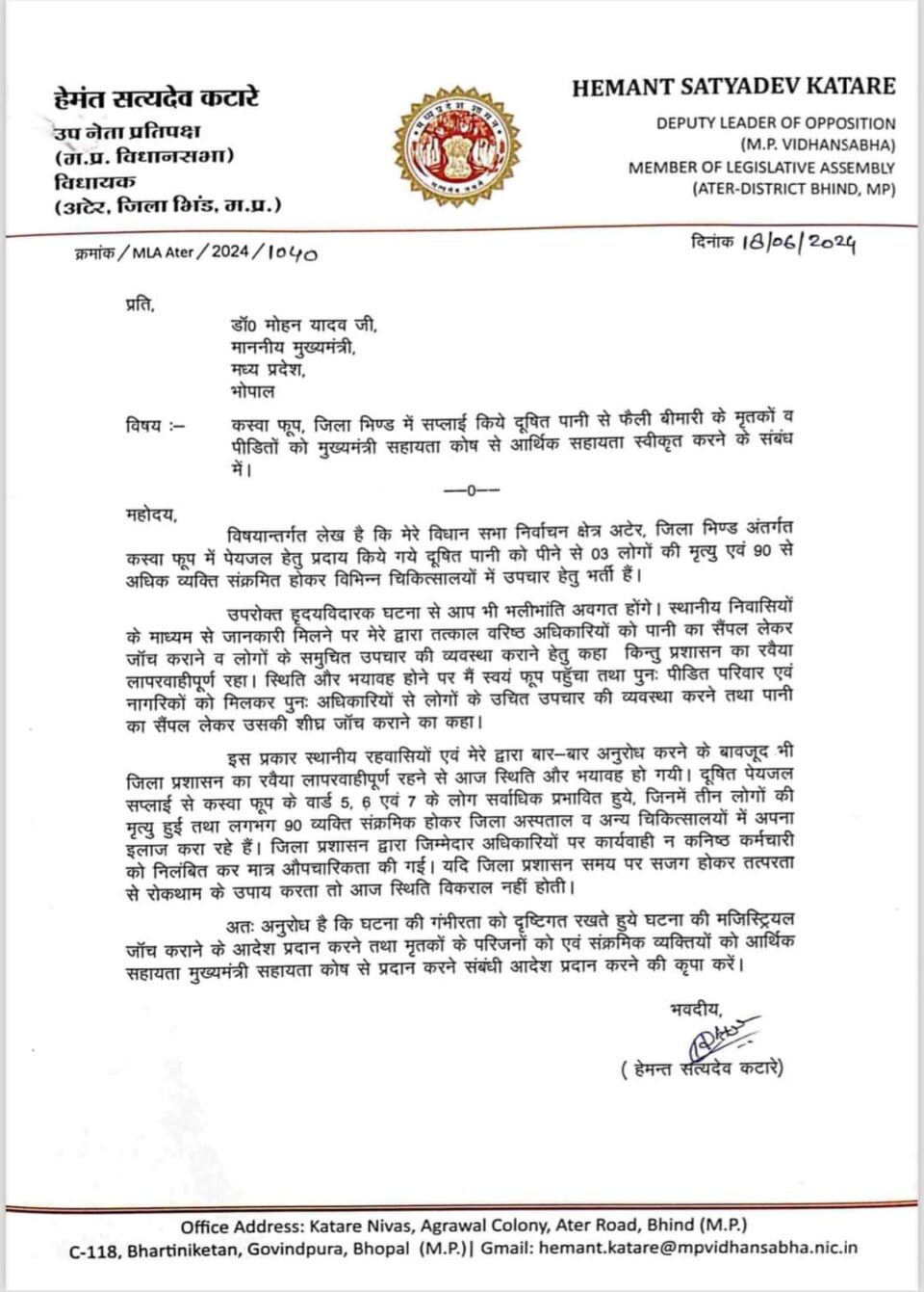 भिण्ड । विधानसभा में उपनेता प्रतिपक्ष व अटेर विधायक हेमंत सत्यदेव कटारे ने मुख्यमंत्री डॉ. मोहन यादव को पत्र लिखकर कहा कि मेरे विधानसभा निर्वाचन क्षेत्र अटेर जिला भिण्ड अंतर्गत कस्बा फूफ में पेयजल हेतु प्रदाय किये गये दूषित पानी को पीने से 03 लोगों की मृत्यु एवं 90 से अधिक व्यक्ति संक्रमित होकर विभिन्न चिकित्सालयों में उपचार हेतु भर्ती हैं।