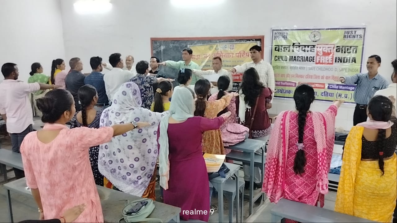 दतिया @Republicbreakingindianews.comबाल विवाह मुक्त भारत अभियान के तहत संचालित बच्चों की न्याय तक पहुँच कार्यक्रम के अंतर्गत संचालित कार्यक्रमों की श्रृंखला में शासकीय स्वशासी महाविद्यालय दतिया में मध्यप्रदेश जन अभियान परिषद के द्वारा संचालित मुख्यमंत्री सामुदायिक नेतृत्व विकास पाठ्यक्रम के अध्ययनरत छात्र-छात्राओं को सामूहिक शपथ कार्यक्रम में मुख्य अतिथि मुनेंद्र शेजवार जिला समन्वयक मप्र जन अभियान परिषद दतिया रहे। अध्यक्षता जिला खेल अधिकारी अरविंद सिंह राणा द्वारा की गई। कार्यक्रम में विशिष्ट अतिथि संतोष उपाध्याय संभागीय अध्यक्ष प्राइवेट स्कूल एसोशिएशन रहे।