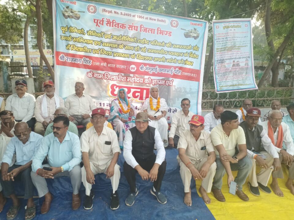 भिण्ड । भूतपूर्व सैनिक संघ के नेतृत्व में भिंड कलेक्ट्रेट पर वीर नारी और पूर्व सैनिक शहीद परिवारों की समस्याओं को लेकर दूसरे दिन भी बैठे धरने पर ,प्रेस को जारी विज्ञप्ति में जिला अध्यक्ष सूबेदार मेजर राकेश सिंह कुशवाह रिटायर्ड ने बताया कि हमारा धरना शहीद परिवारों को उनका सम्मान वापिस दिलाने को लेकर है,हमारे फौजियों की जमीनों पर कब्जे हो रहे हैं पूर्व सैनिक जगह जगह मारे मारे फिर रहे हैं कोई सुनने वाला नहीं है,अमर शहीद पवन भदौरिया के परिवार को सम्मान राशि अभी तक नहीं मिली जिसमें भिंड कलेक्टर ने कोई कार्यवाही नहीं की उनके पिताजी राजकुमार भदौरिया को ऑफिस में खड़े रखा बैठने तक कुर्सी नहीं दी बदतमीजी से बात की कुछ दिन पहले कैप्टन ज्ञानेंद्र सिंह भदौरिया से अभद्र बरताव किया, शहीद कालोनी को तोड़ने के नोटिस दिए हैं,दूसरे दिन भी धरने पर भिंड कलेक्टर नहीं आए भिंड की भूमि पर जिस तरह भिंड कलेक्टर संजीव श्रीवास्तव द्वारा पूर्व सैनिकों और शहीद परिवारों के धरने को नजर अंदाज किया गया वो निंदनीय है,भूतपूर्व सैनिकों ने कहा कि हमारी मांगे तुरंत मानी जाए भिंड कलेक्टर अपने राजशाही व्यवहार के लिए माफी मांगे अन्यथा कल से आंदोलन का स्वरूप कलेक्टर ने अपनी पूरी नौकरी में नहीं देखा होगा वैसा दिखाई देगा आज के धरने में कार्यकारी अध्यक्षअजमेर सिंह भदौरिया,कैप्टन हुकुम सिंह,पुष्पराज सिंह,कप्तान सिंह,राममिलन सिंह भदौरिया,महेश करारिया फौजी गोहद,रामजीलाल भदौरिया,रमेश पाल,शिवरतन सिंह तोमर, करन सिंह,रामजी लाल बघेल,अतर सिंह गुर्जर,रामलछमन सिंह,रामबरन सिंह,रघुराज सिंह,एन के शर्मा, राधाकृष्ण शर्मा,कुलदीप सिंह भदौरिया,शिवरतन सिंह भदौरिया आदि पूर्व सैनिक शामिल रहे।