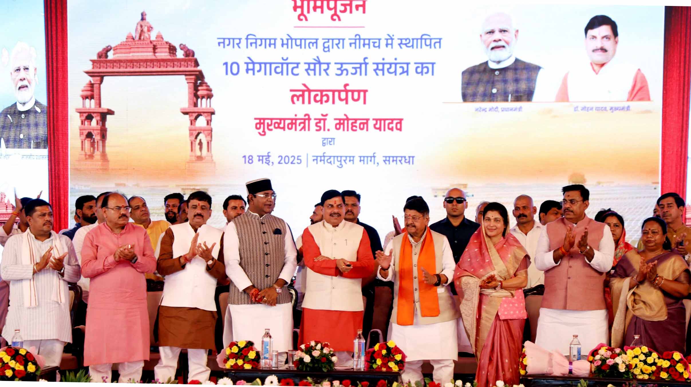 नगरीय विकास एवं आवास मंत्री श्री कैलाश विजयवर्गीय ने कहा कि मुख्यमंत्री डॉ. यादव ने नेतृत्व में हम आत्मनिर्भर मध्यप्रदेश के साथ-साथ आत्मनिर्भर नगर निगम व नगर पालिका के सपने को साकार करने की ओर अग्रसर हो रहे हैं। भोपाल नगर निगम द्वार नीमच में सौर ऊर्जा संयंत्र स्थापित करना, आत्मनिर्भता की ओर एक प्रभावी कदम है। भोपाल महापौर श्रीमती मालती राय ने बताया कि 5 करोड़ रुपए की लागत से “भोज-नर्मदा द्वार” का निर्माण होगा। उन्होंने कहा कि भोपाल नगर निगम द्वारा नीमच में स्थापित किए जा रहे सोलर पैनल से उत्पादित बिजली का उपयोग भोपाल की जल प्रदाय व्यवस्था के संचालन में किया जाएगा। कार्यक्रम को विधायक श्री रामेश्वर शर्मा ने भी संबोधित किया।