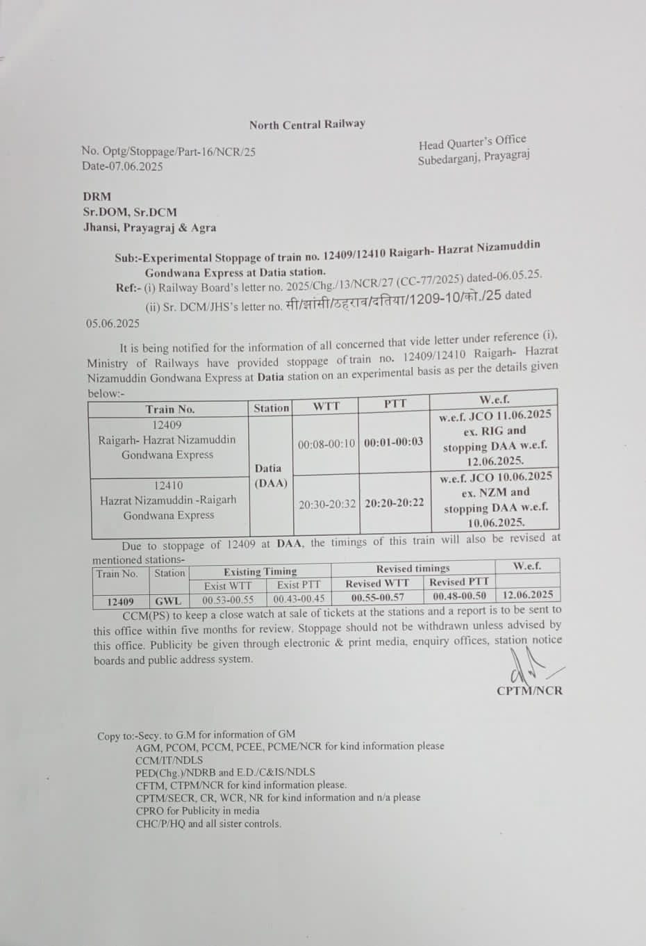 वहीं गाड़ी संख्या 12409 रायगढ़ – हज़रत निजामुद्दीन गोंडवाना एक्सप्रेस का दतिया स्टेशन पर ठहराव दिनांक *12.06.25* समय 00:01- 00:03 बजे होगा।